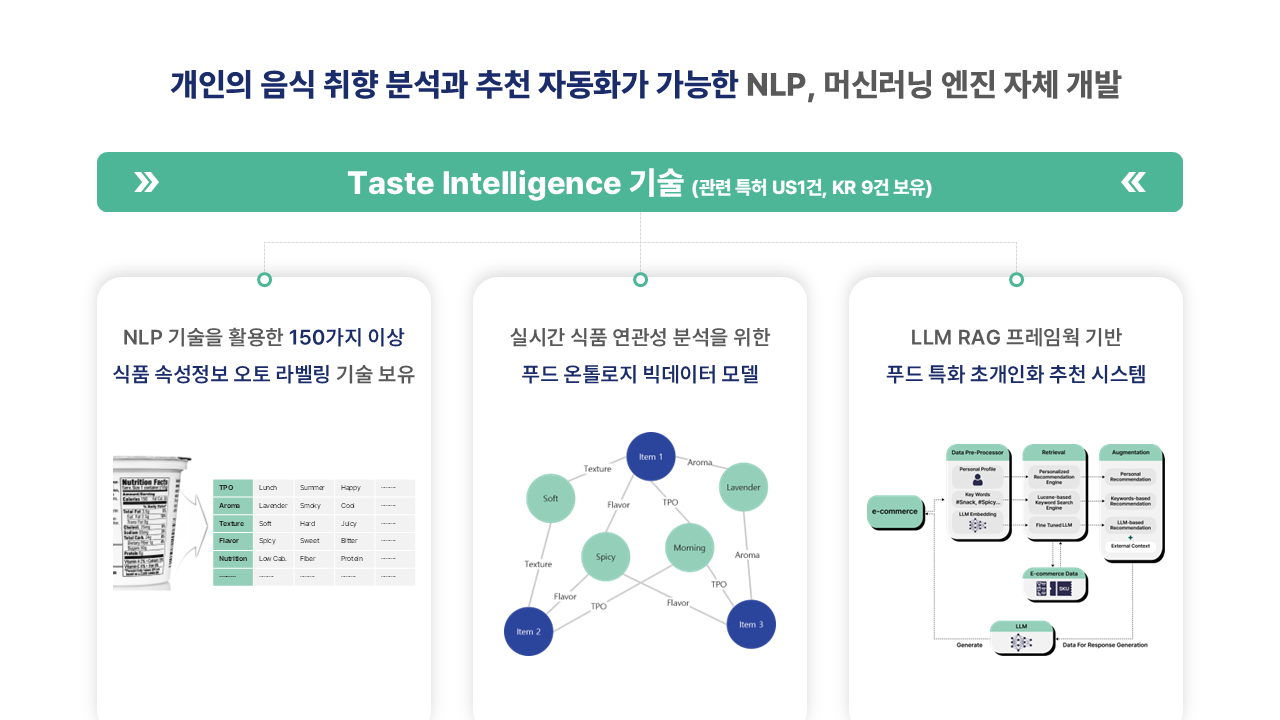 식품은 가장 보편적인 소비재이자 가장 보수적인 산업이다. 수요는 명확하지만 '취향'이라는 비정형 변수 탓에 디지털 전환은 여전히 더디다. 양 대표는 이러한 식품 산업에 인공지능 기술로 도전장을 내민다. 그는 식재료의 영양 성분, 조리법, 식감, 풍미, 음식 간 유사도 등 여러 요소를 종합적으로 분석하는 알고리즘 '테이스트-인텔리전스(미식 지능)'을 개발했다.
