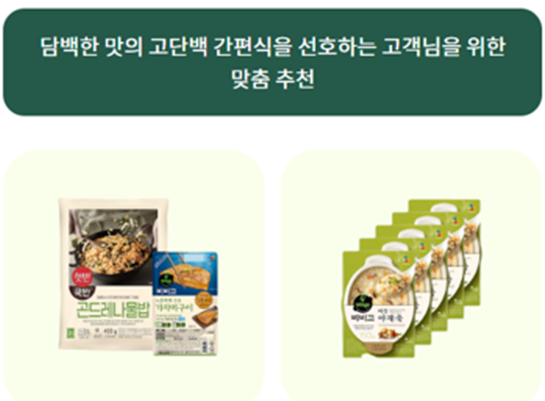 (1) 푸드큐는 홈 화면 맞춤 추천 기능을 통해 유저의 첫인상이 될 수 있는 메인 페이지 내에서 인공지능 기반 개인화 추천 상품을 노출합니다. 이때 MD가 리스트업한 상품 추천이 아닌, 유저의 상품 구매 이력, 입맛 취향 등 개인의 데이터를 바탕으로 한 취향 기반 개인화 추천 상품을 노출합니다.