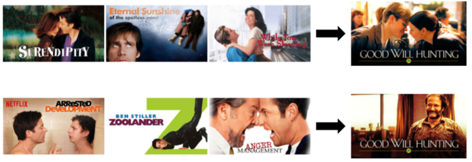 예를 들어, 위의 사진처럼 영화 ‘굿윌헌팅’의 동일한 예시가 있을 때, 로맨스 영화를 주로 시청한 이력이 있는 이용자 A에는 영화 ‘굿윌헌팅’ 중 로맨틱한 장면을 캡처한 섬네일 포스터를 노출하고, 코미디 영화를 주로 시청한 이력이 있는 이용자 B에게는 코미디의 대가인, 배우 ‘로빈 윌리엄스’가 등장하는 장면의 포스터를 노출합니다.
