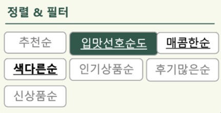(3) 마지막으로 유저가 푸드커머스 플랫폼을 탐험하며 얻은 데이터와 입맛 취향 데이터 등을 종합하여 유저가 상품을 검색하는 데에 효과적인 도움을 줍니다. 카테고리 또는 검색 결과 페이지에서 조회하게 되는 상품들을 인공지능으로 개인화하여 정렬합니다. 이때 해당 페이지의 기본 정렬 및 필터를 '입맛 선호도 순', '색다른 순' 등으로 대체가 가능합니다. 이러한 기능은 기존의 '인기 순', '신상품 순'의 정렬일 경우에 비해 유저가 약 50% 빠르게 원하는 상품에 도달할 수 있도록 합니다.
